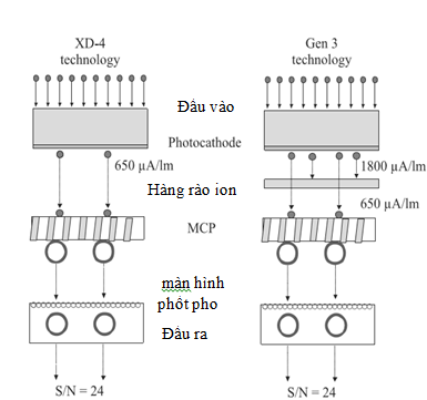 | 3 không phủ lớp | GaAs/GaAsP | < 2200 | Ống không phủ lớp, MCP hội tụ gần | < 80.000 | 57-71 | 24-31 |