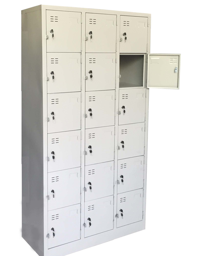 Tủ sắt để giầy dép là loại tủ locker sắt 18 ngăn thêm khay có chất lượng cao, an toàn với người sử dụng. Sử dụng tủ để giày dép làm tăng tính thẩm mỹ cho không gian làm việc, mọi thứ sẽ được chỉnh chu ngăn nắp và gọn gàng hơn rất nhiều. Mục đích lưu trữ của loại tủ sắt này dành cho vật dụng là giày dép công nhân nhằm ngăn chặn trộm cắp thất lạc tại nơi làm việc.