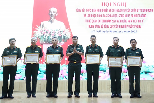 Trung tướng Hồ Quang Tuấn, Chủ nhiệm Tổng cục CNQP, trao Bằng khen của Tổng cục tặng các tập thể đạt thành tích xuất sắc trong thực hiện Nghị quyết 791.
