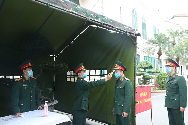 Quân y cơ quan Tổng cục CNQP đo thân nhiệt cho cán bộ, sĩ quan trước khi vào làm việc để phòng, chống bệnh viêm đường hô hấp cấp do chủng mới của virus corona (COVID-19).